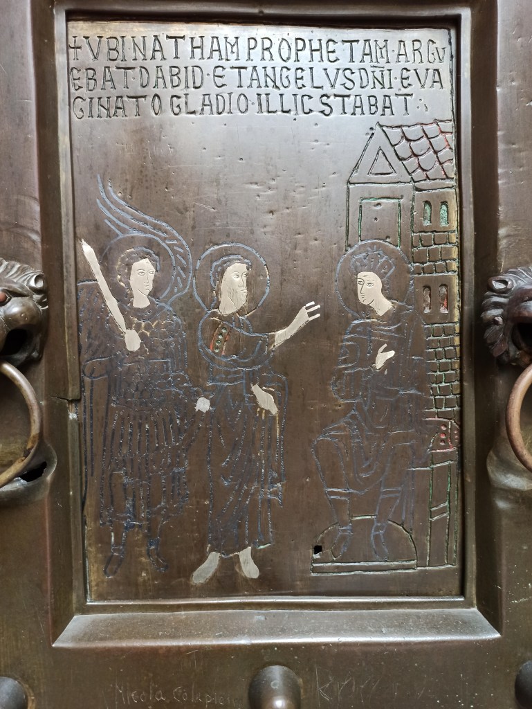 This month’s research trip lead us to another one of Barisano’s doors in Trani. To protect the original door, a copy was placed on the outside of the cathedral so we could quietly work on the original inside the cathedral, while outside the festivities of the Croce di Colonna with lots of fire works were ongoing. Of course we could not miss to visit also Bari to study the lion handles of another contemporary door: it turned out that they were made of gilded copper! Canosa and the bronze doors of the Tomb of Bohemond had to be visited as well – including sound studies of opening and closing the doors. Finally, we went 800 m above sea level to visit Monte Sant’Angelo and documented one of the eight byzantine doors still preserved today in Italy: the door is in perfect condition and was coloured in red, green, and dark grey, and of course, silver. Even more, we found traces of gilding!